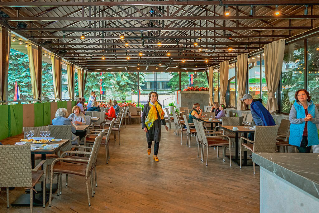 Летнее кафе санатория «Джинал» в Кисловодске позволяет гостям здравницы сполна насладиться приятной погодой, посидеть в уютной обстановке, наслаждаясь вкусной и свежей едой, напитками и общением.